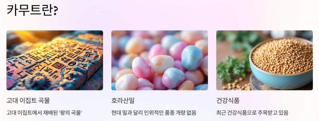카무트는 고대 이집트에서 재배되던 '왕의 곡물'입니다. '호라산밀'이라고도 불리는 이 곡물은 현대의 밀과 달리 인위적인 품종 개량을 거치지 않은 자연 그대로의 곡물로, 최근 건강식품으로 큰 주목을 받고 있습니다.