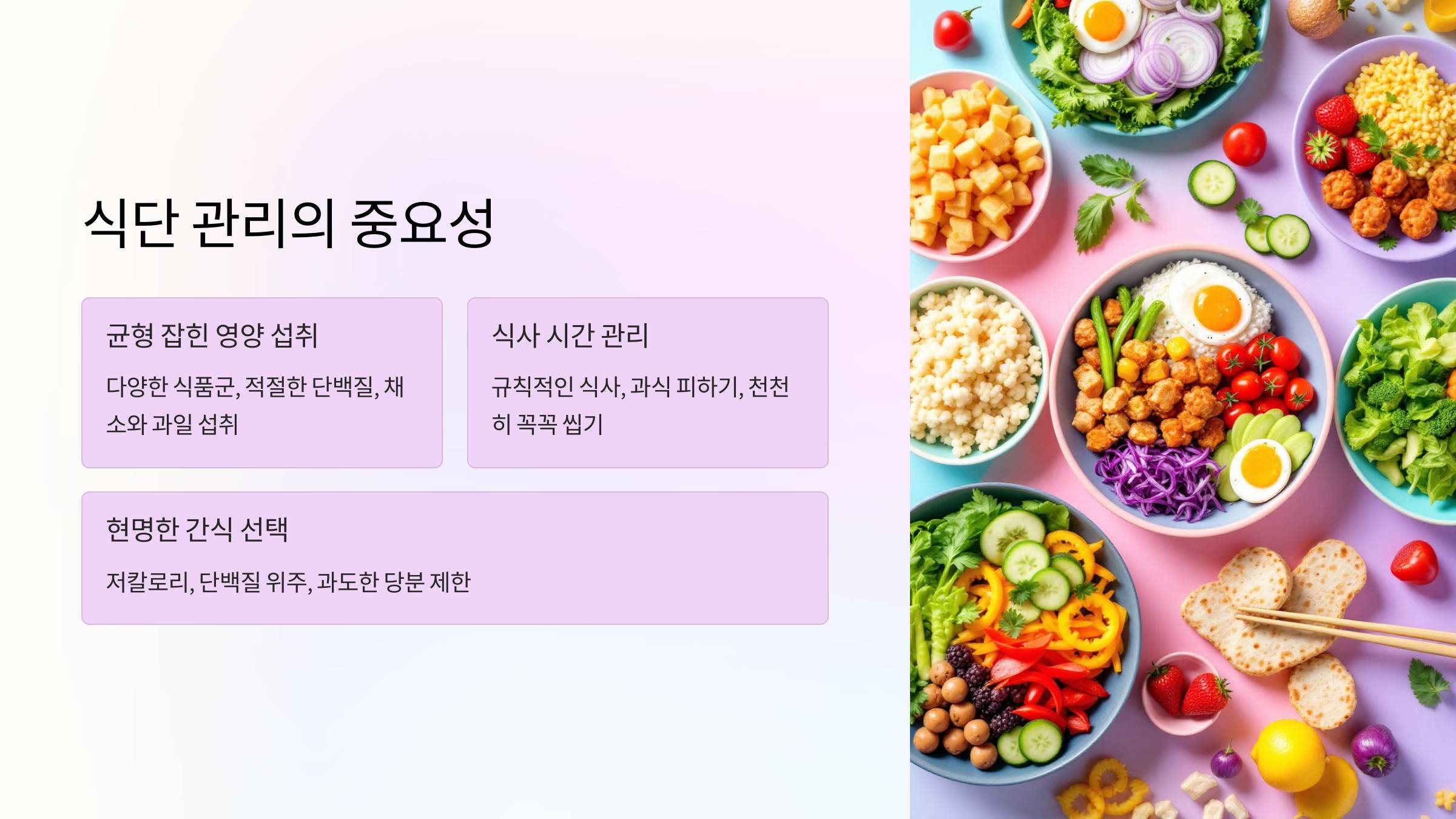 무엇보다 중요한 것은 지속 가능한 다이어트 계획을 세우는 것입니다. 하루아침에 큰 변화를 기대하기보다는, 작은 습관부터 하나씩 개선해 나가는 것이 성공의 지름길이 될 것입니다.