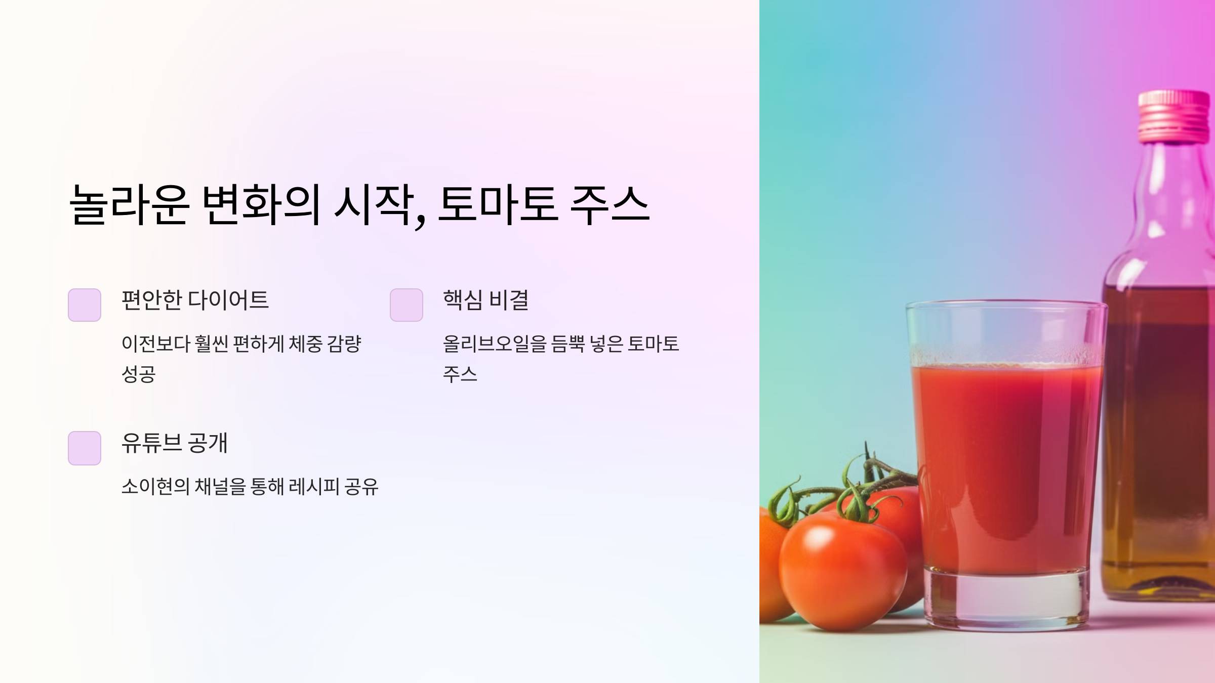 건강한 다이어트를 시작하고 싶은 분들이라면, 소이현의 토마토 주스 레시피를 시도해보는 것은 어떨까요? 맛있게 먹으면서 건강도 챙기는 일석이조의 효과를 경험하실 수 있을 겁니다.