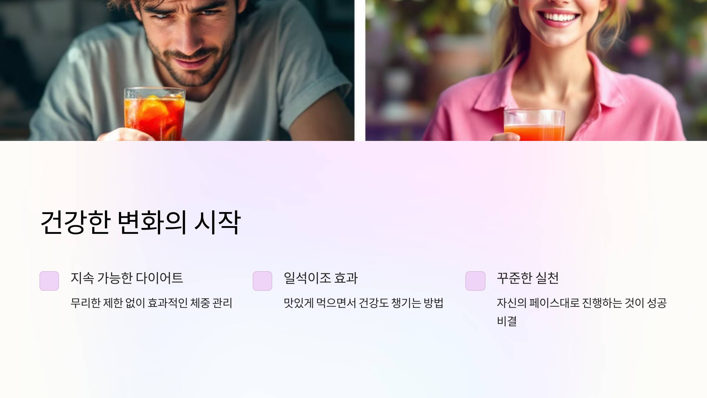 - 포만감 증가: 주스 한 잔으로도 불필요한 간식 섭취를 줄일 수 있습니다.