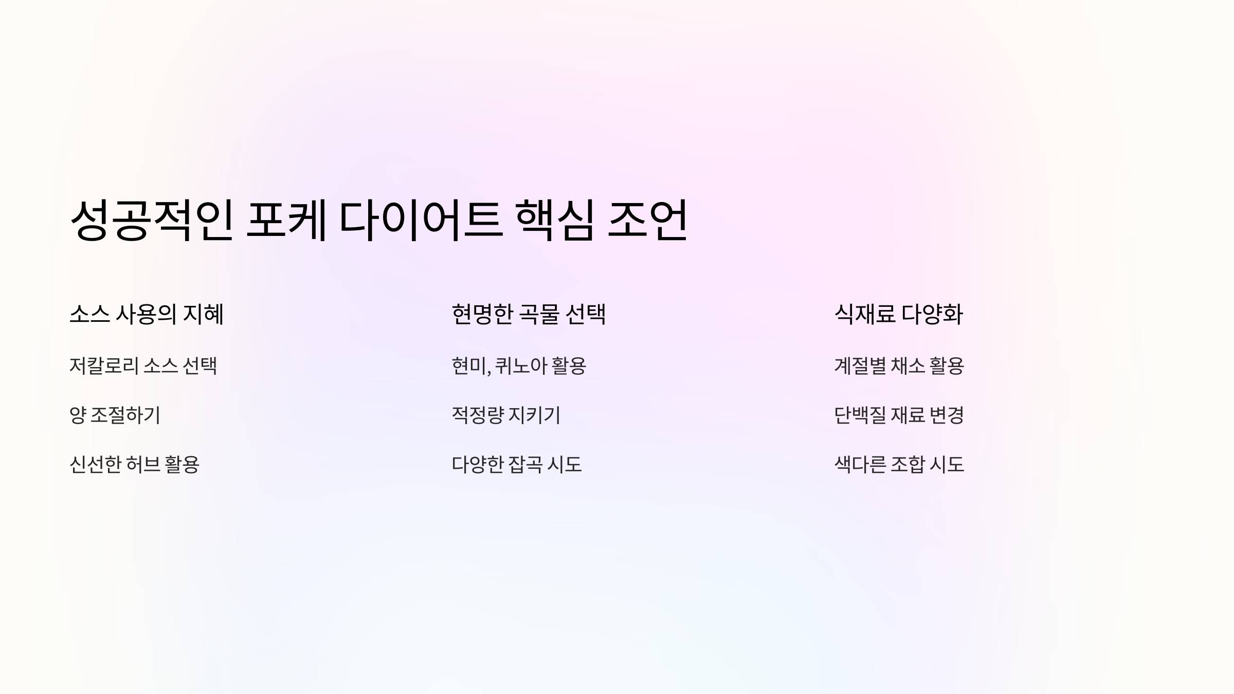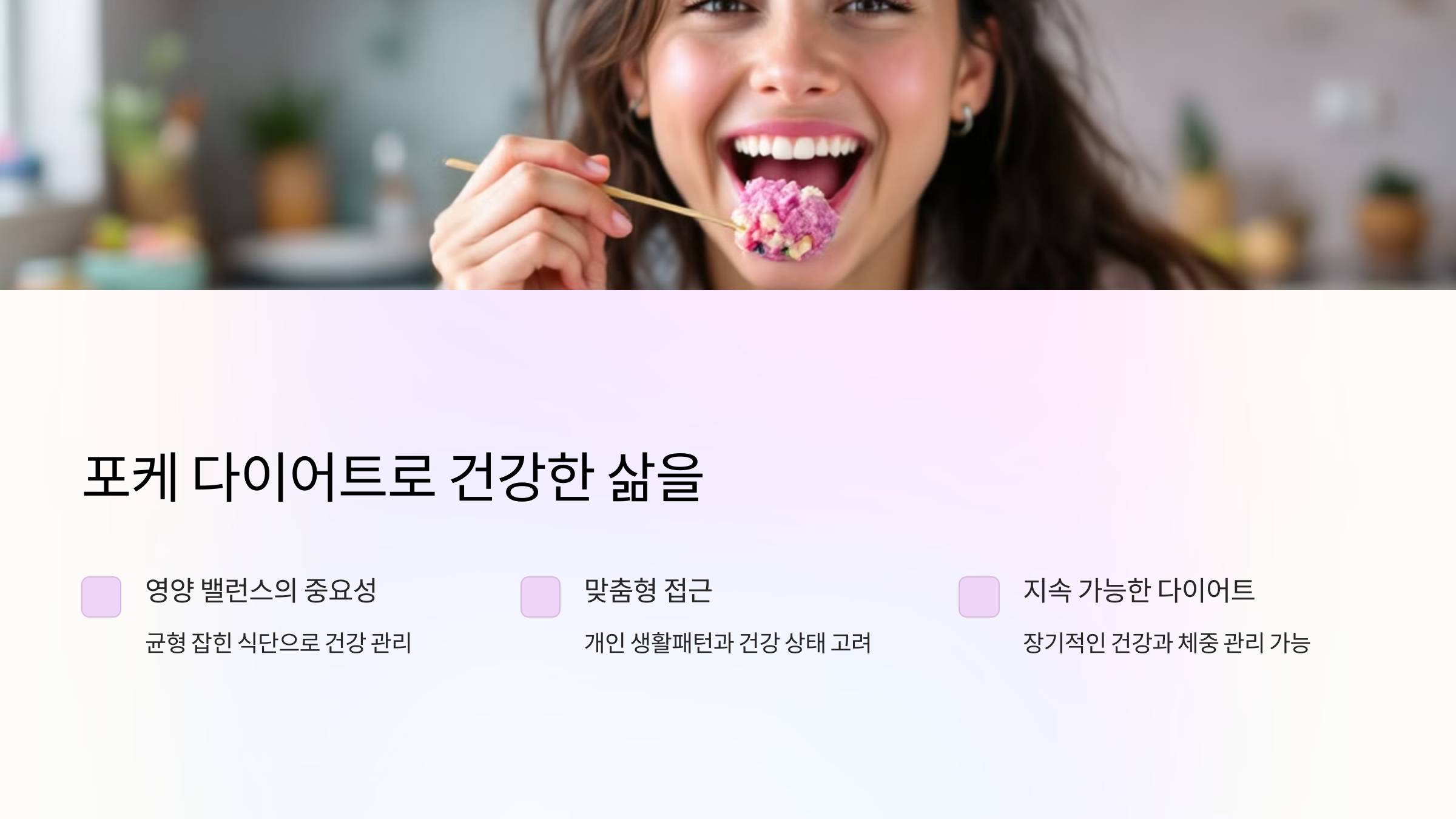 손태영의 포케 다이어트가 주목받는 이유는 바로 완벽한 영양 균형에 있습니다. 극단적인 식단 제한 대신, 필수 영양소를 골고루 섭취하면서도 체중 감량이 가능한 현명한 접근법을 보여줍니다. 단백질, 탄수화물, 지방의 황금비율을 맞춘 이 식단은 지속 가능한 다이어트를 가능하게 합니다.