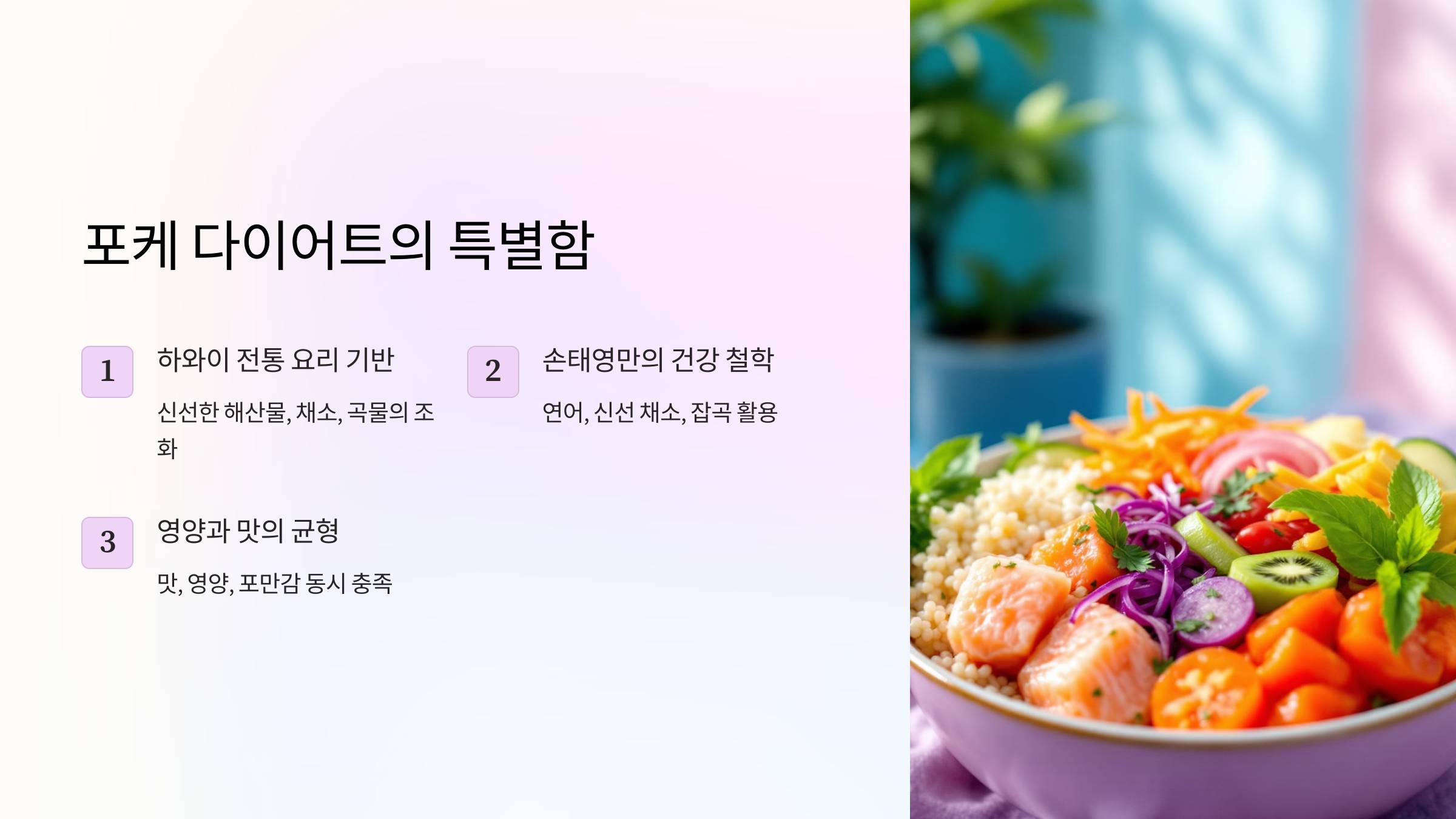 하와이의 전통 요리인 포케는 신선한 해산물과 채소, 곡물을 조화롭게 담아낸 건강식입니다. 손태영이 제안하는 포케 다이어트는 일반적인 포케에 그녀만의 건강 철학을 더해 완성됐습니다. 연어, 신선한 채소, 잡곡을 주재료로 활용하며, 맛과 영양, 그리고 포만감까지 동시에 충족시키는 똑똑한 식단입니다.