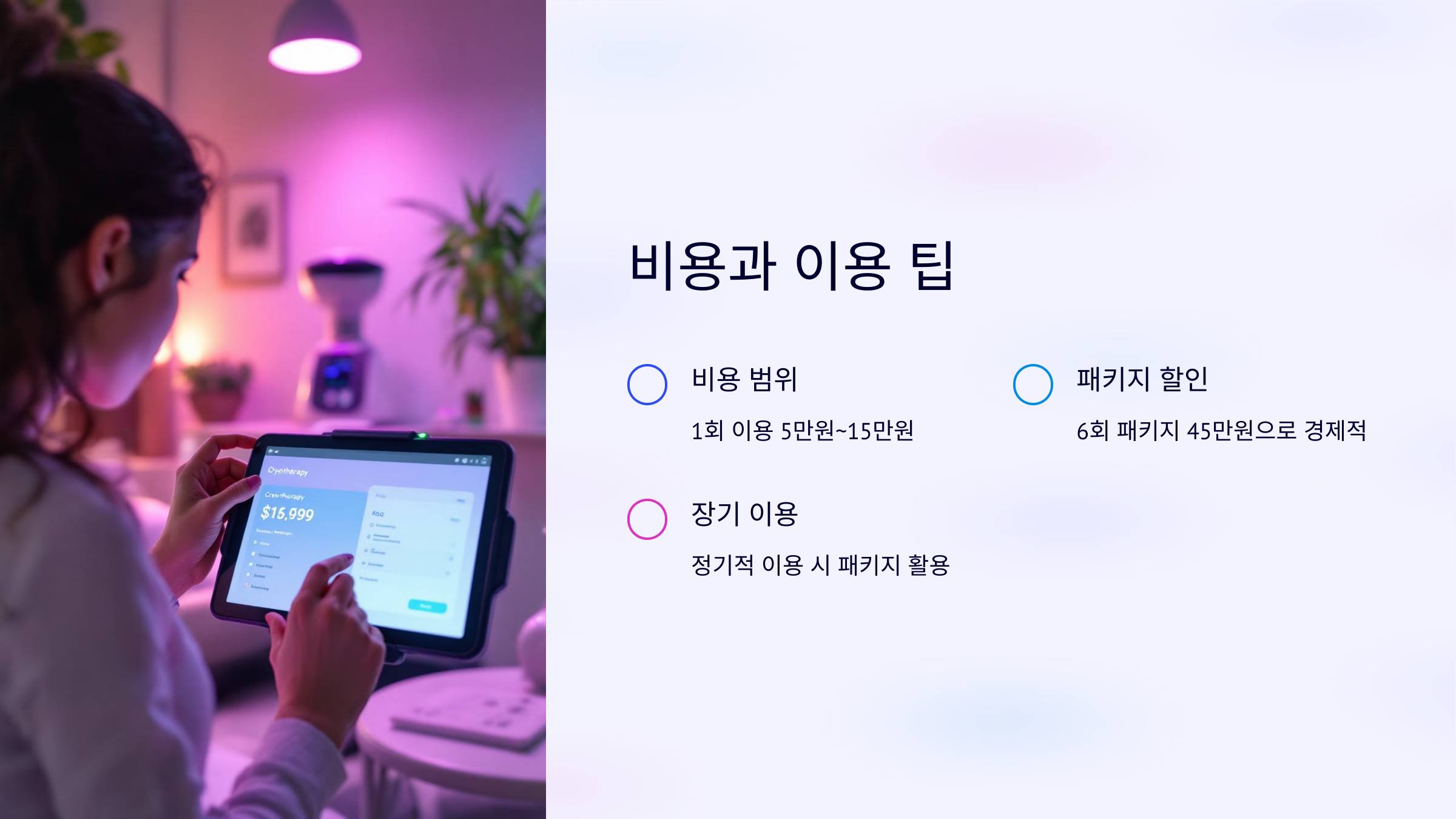 크라이오테라피 1회 이용 비용은 보통 5만원에서 15만원 정도로 시설마다 차이가 있습니다. 저는 6회 패키지로 45만원에 이용했는데요, 정기적으로 받을 계획이라면 패키지 구매가 훨씬 경제적이에요. 혜리처럼 장기간 이용하시는 분들은 대부분 패키지를 활용한다고 합니다.