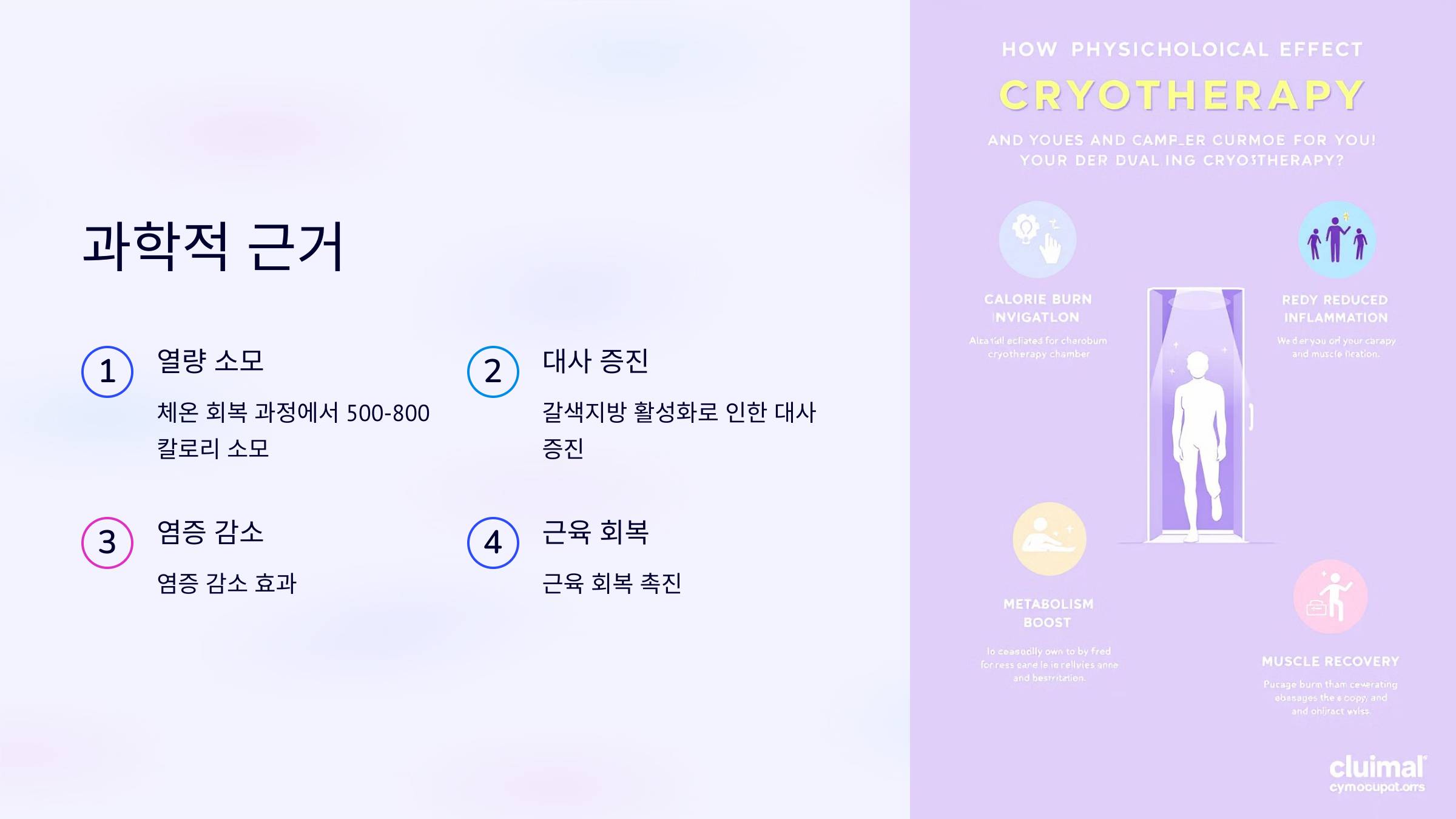 과학적으로도 크라이오테라피는 우리 몸의 대사를 활성화하고, 염증을 줄이며, 근육 회복을 돕는다는 연구 결과들이 있습니다. 하지만 모든 사람에게 똑같은 효과가 있는 것은 아니니, 본인의 건강 상태와 목적에 맞게 선택하시면 좋을 것 같아요.