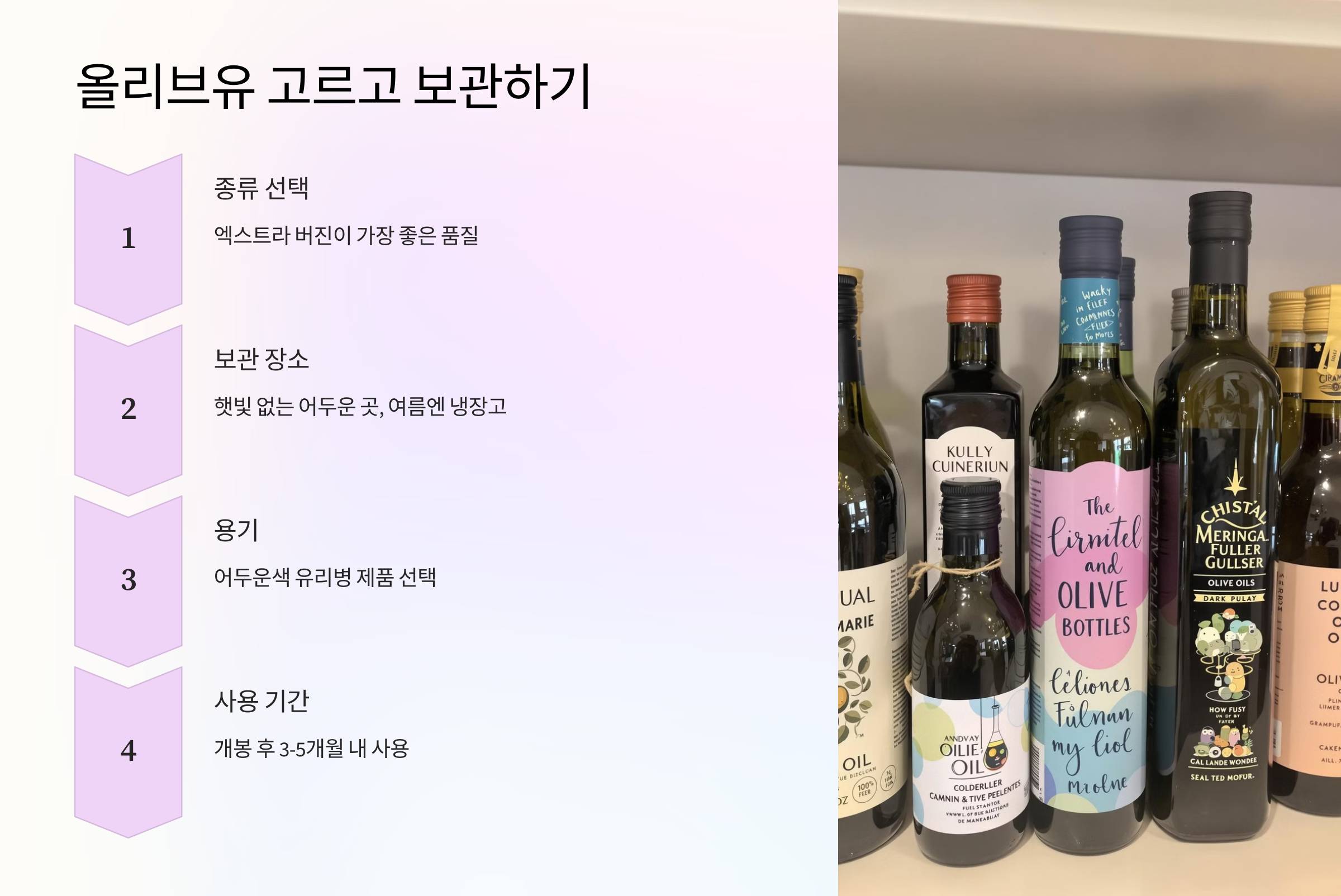 효과를 제대로 보려면 올리브유를 잘 고르고 보관하는 방법도 알아야 하는데요.