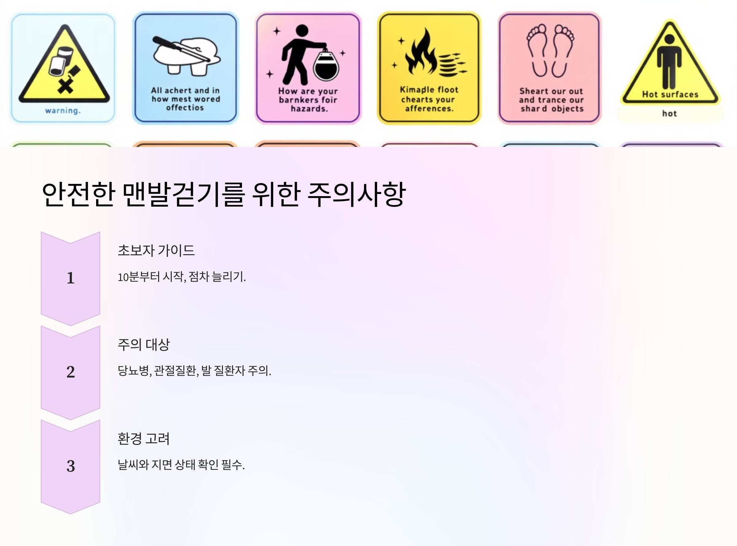 - 발바닥에 무리가 가지 않도록 중간중간 휴식을 취하는 것이 중요합니다.