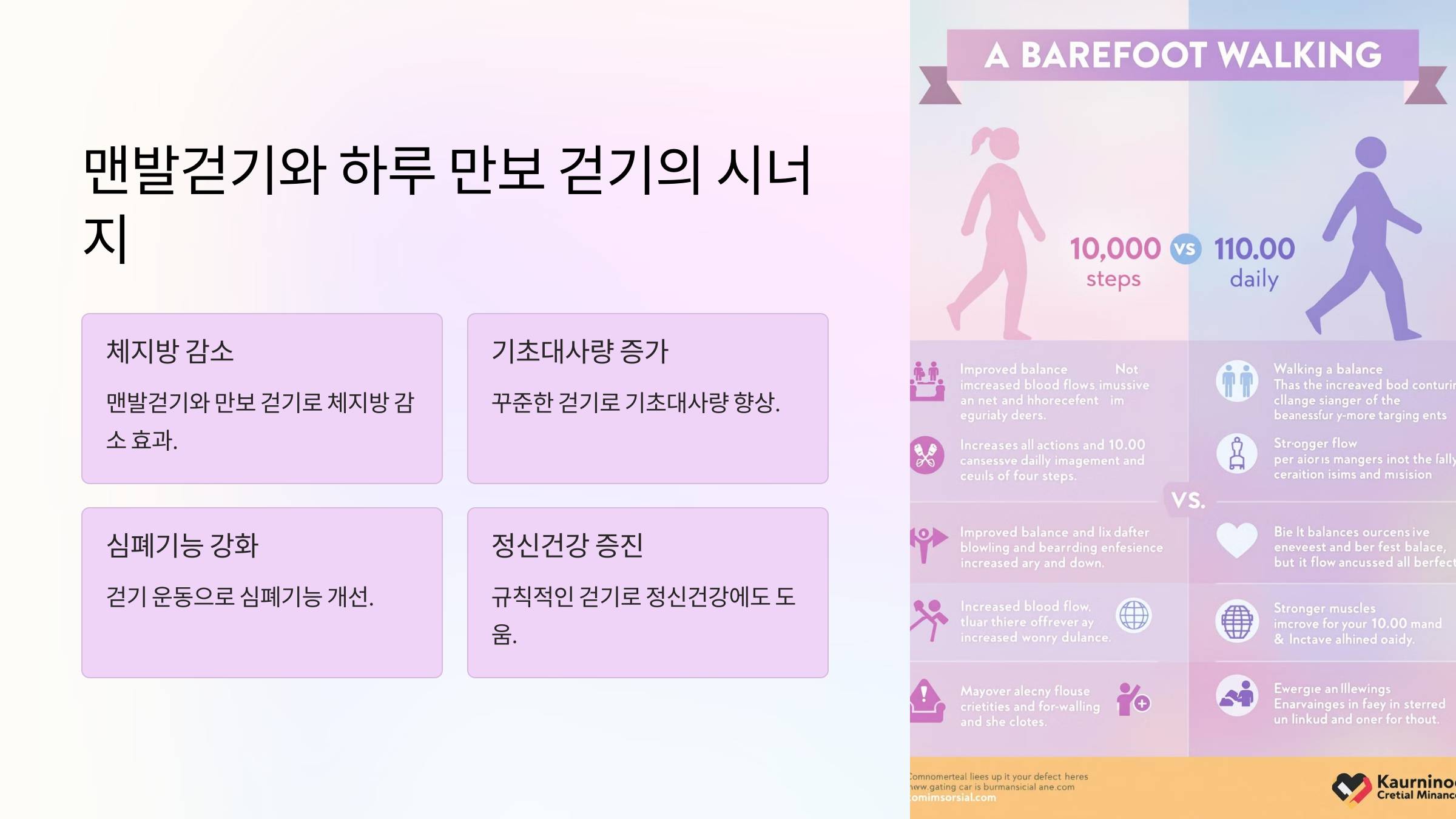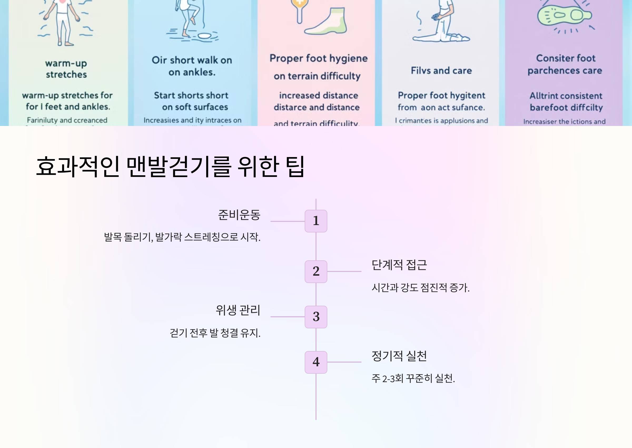 한가인 배우처럼 걷기 운동의 효과를 극대화하고 싶다면, 맨발 걷기와 함께 하루 만보 걷기를 실천해보세요. 두 가지 운동을 병행하면 다양한 건강 효과를 얻을 수 있습니다.