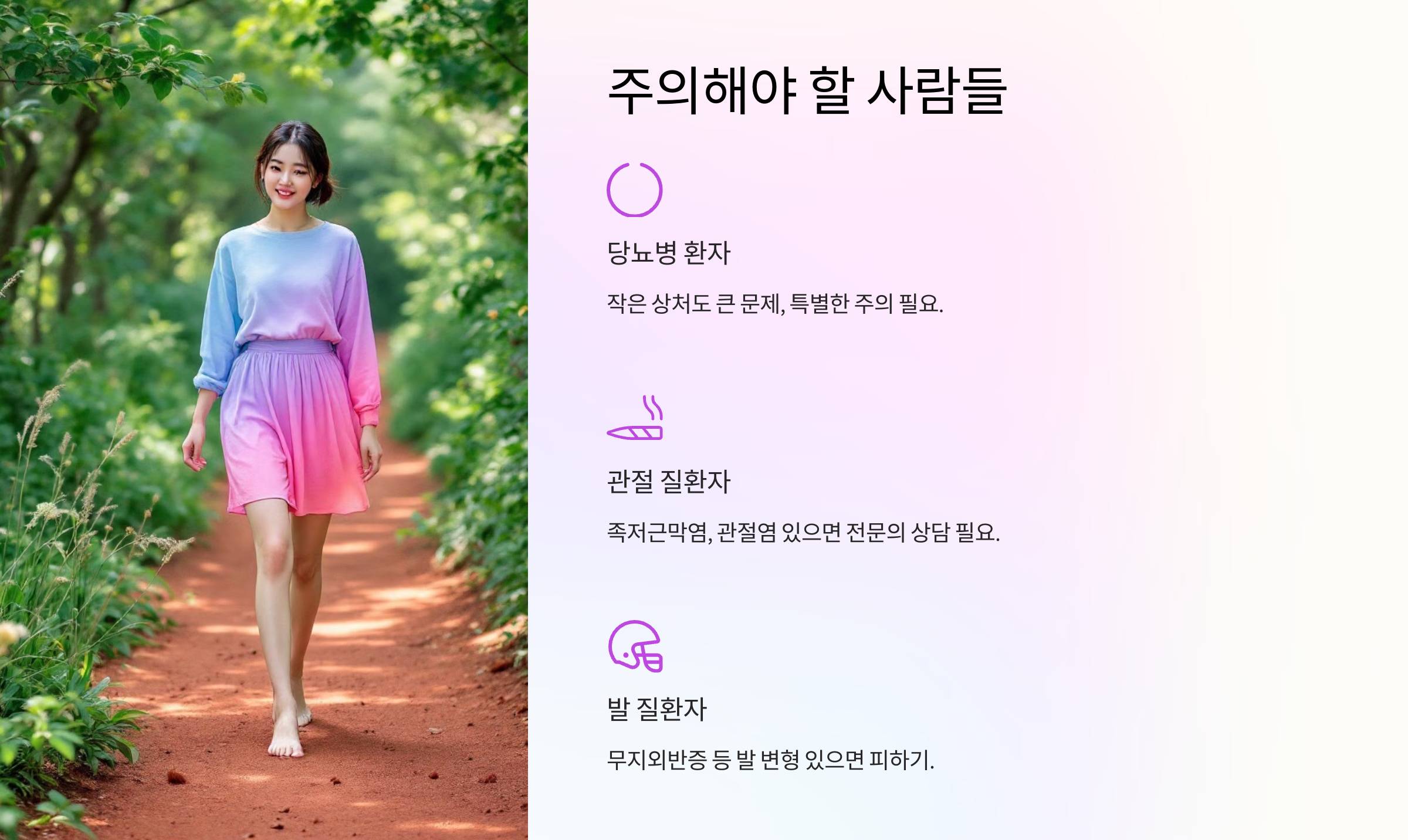 - 발 질환자: 무지외반증 등 발 변형이 있는 사람은 맨발 걷기를 피하는 것이 바람직합니다.