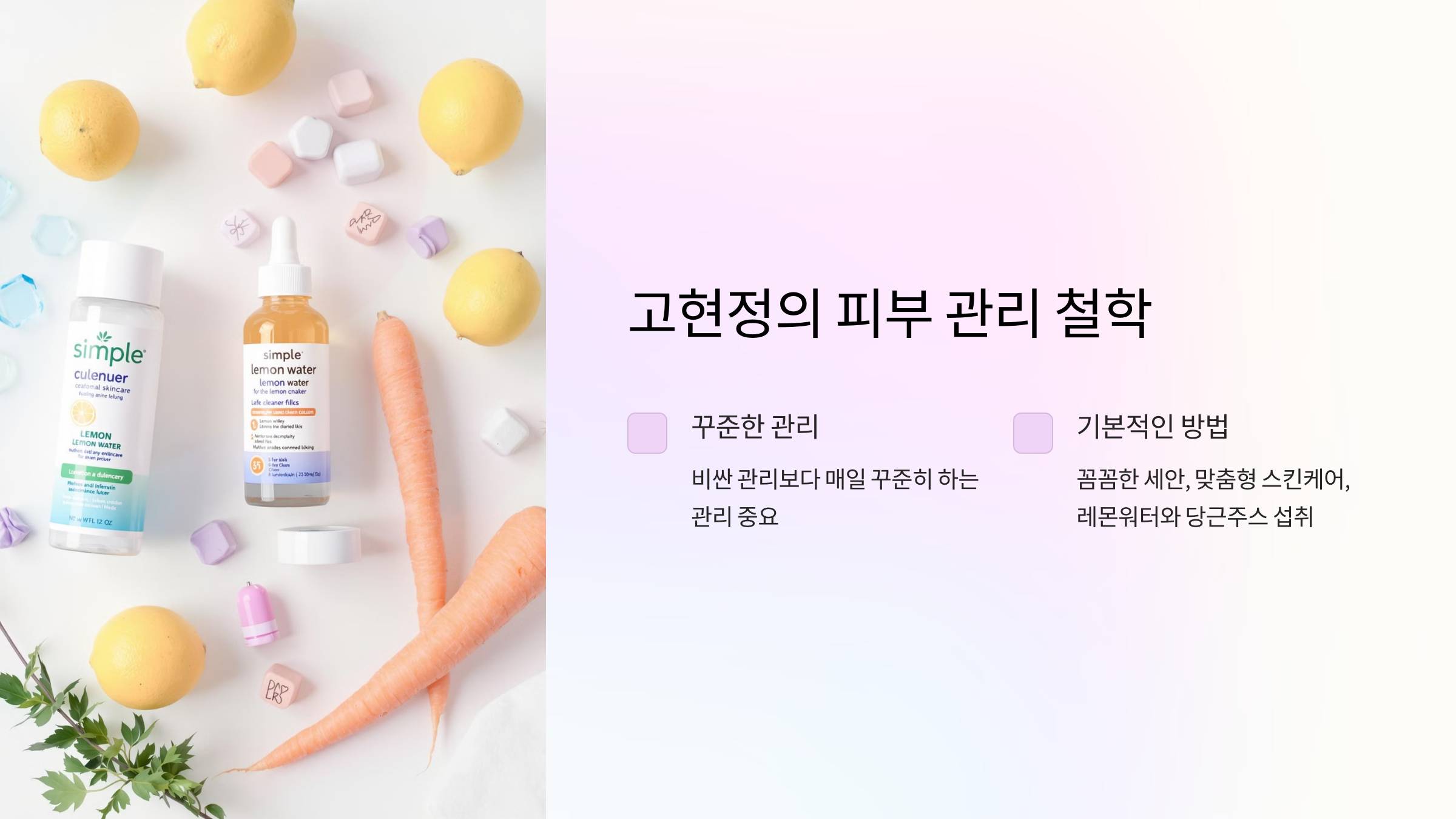 이것이 바로 고현정의 뷰티 철학입니다. 그녀는 고가의 정기적인 피부 관리 대신, 매일 마시는 레몬워터와 당근주스로 피부 건강을 챙기고 있다고 해요.