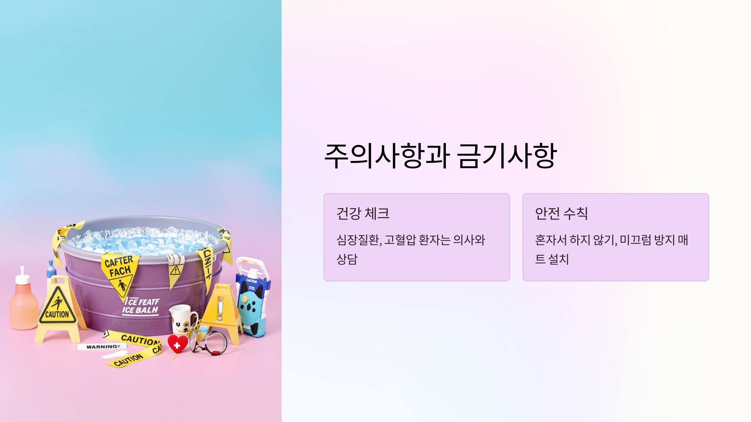 콜드 플런지는 많은 이점이 있지만, 몇 가지 주의사항도 있습니다. 안전하게 실천하려면 다음 사항들을 체크해야 해요.